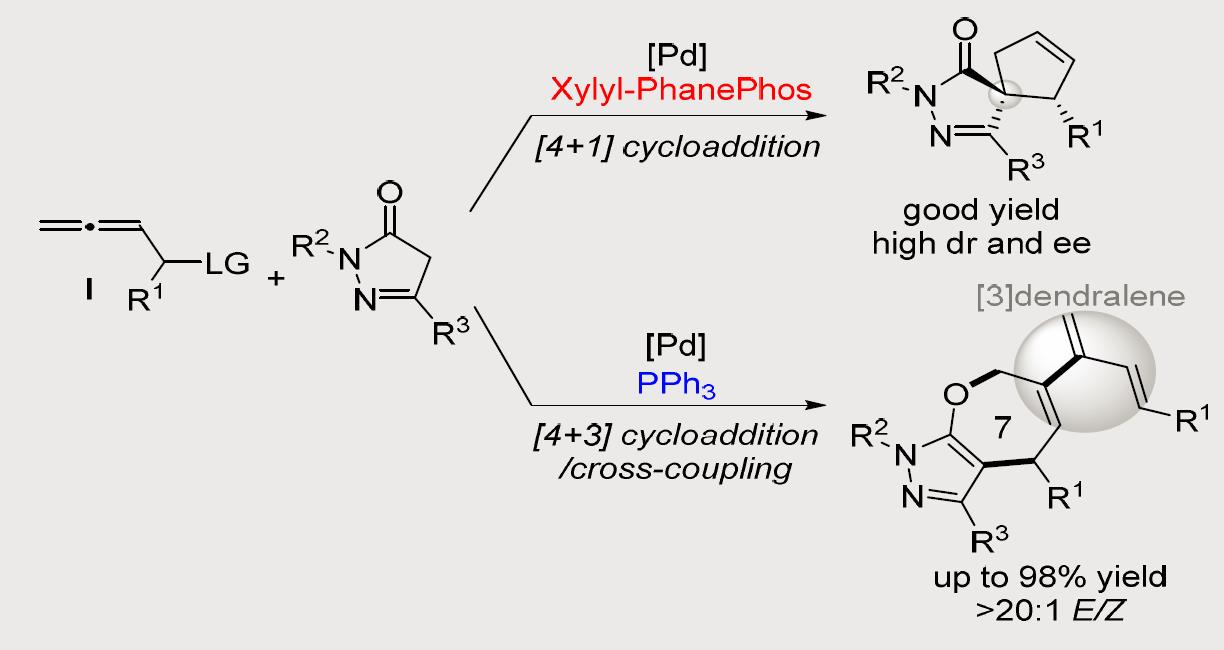 最近,该课题组通过发展2,3-联烯醇酯作为一类新型的1,4-双亲电试剂和四碳单元,首次实现了钯催化的不对称[4 + 1]环加成反应,为手性环戊烯的构建提供了一种新方法。同时,通过调控钯催化剂的配体,发展了[4 + 3]环加成/交叉偶联反应新模式,为官能团化七元氧杂环的合成提供了一种新途径。