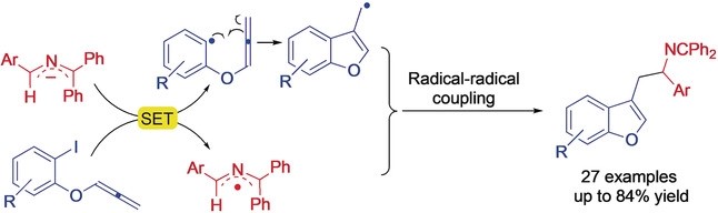 该论文工作以原料易得的2-氮杂烯丙基和碘代芳基丙二烯基醚为反应物,在双(三甲基硅基)氨基钠为碱、乙二醇二甲醚(DME)为溶剂的反应体系中,室温条件下,首次实现了自由基环化串联分子间偶联反应,应用于苯并呋喃乙胺类化合物的合成。该方法具有良好的普适性,同时可以拓展合成一系列常规合成方法难以制备的多功能化、多(杂)环苯并呋喃衍生物,也可以扩环合成一系列苯并六元或七元氧杂环衍生物。值得一提的是,该串联反应不需要过渡金属催化、无配体,避免了在后处理过程中过渡金属杂质分离的难度,同时降低反应成本,避免了来自可持续性的挑战问题,这将有助于该工作今后在制药领域中的应用。